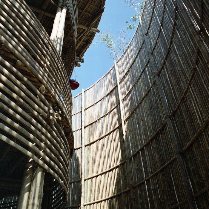Thus the structure is all bamboo - wall, stair, floors and roof - and is built using traditional techniques employing ropes and strings rather than nails and clamps. The roof is formed of local thatch deployed over the bamboo structure, impenetrable against high rainfall. The project was designed and detailed in three days, and constructed in a month.