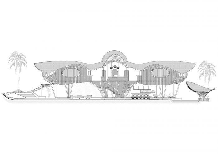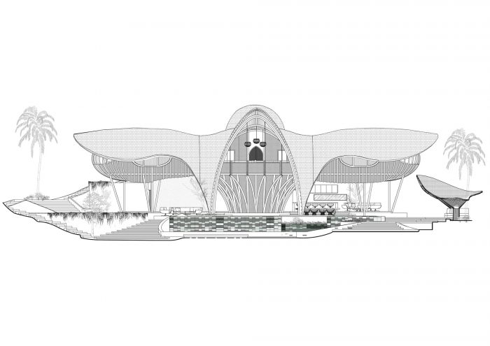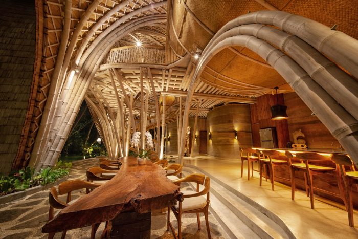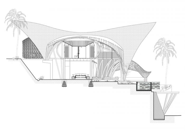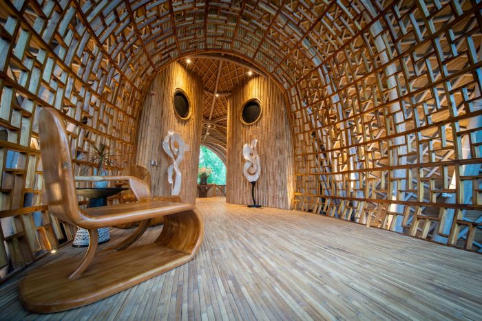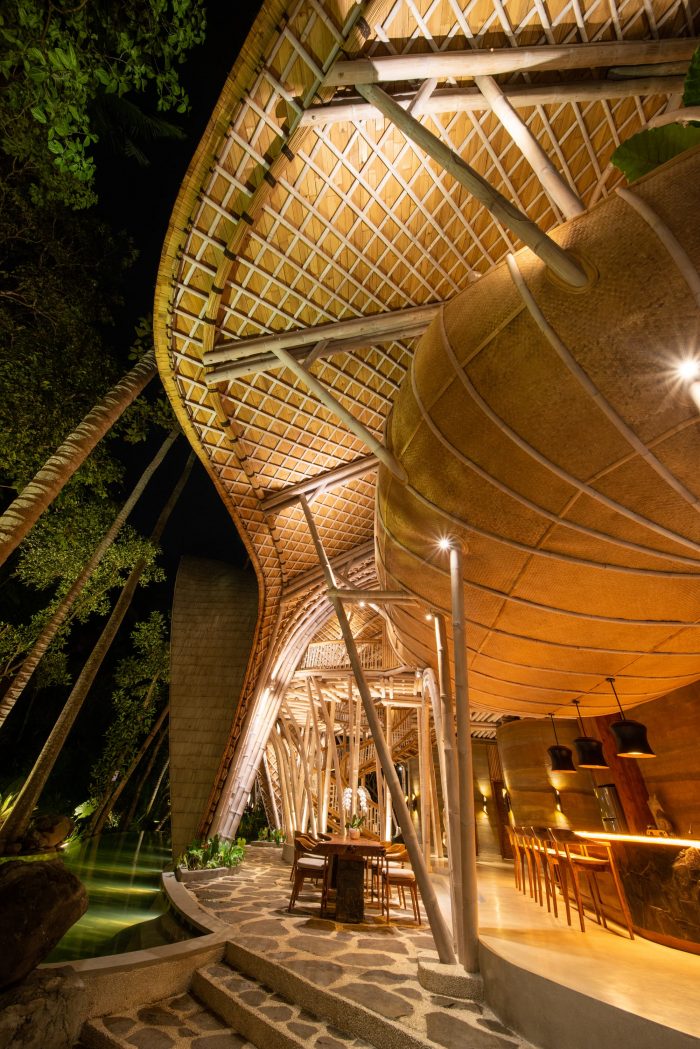 The rest of the structure has been made with bamboo, much of which was harvested from the site. Not only is this fast growing material incredibly sustainable, its flexibility means were able to create spaces that echo the abundance of life in the tropics. Built objects have been created which seek to biologically morph from the surrounding elements, in effect growing from the ground and sprouting among the rich vegetation.