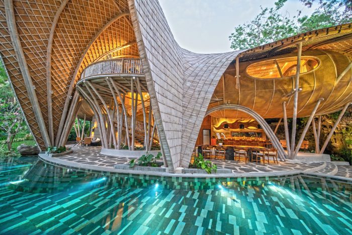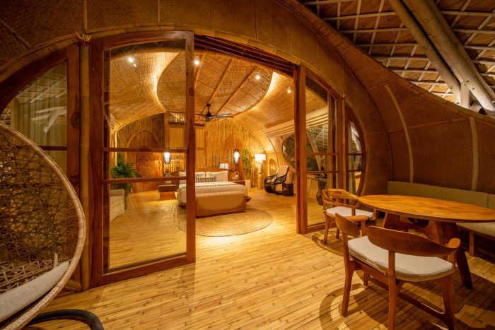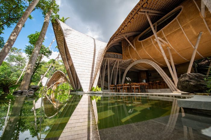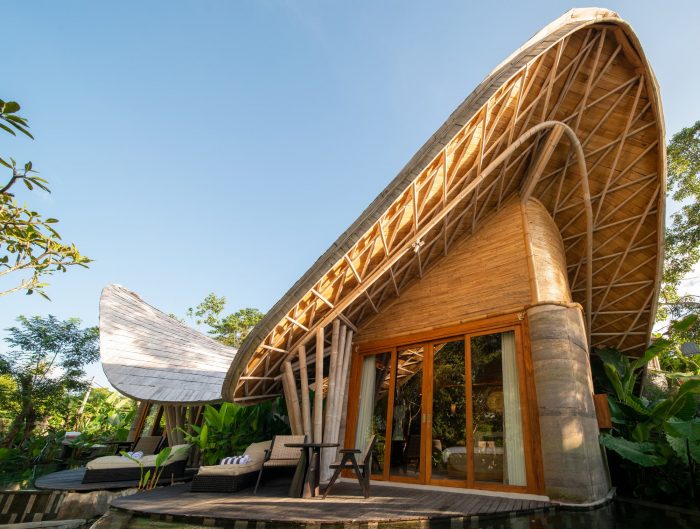 The guest villas too look towards a unique design, yet with the common denominator of bamboo architecture and the warming tones of rammed earth that make up the resort. The curvilinear formations of the roofs can be admired from different heights and angles while the reflections from the meandering pool below add to the effect.