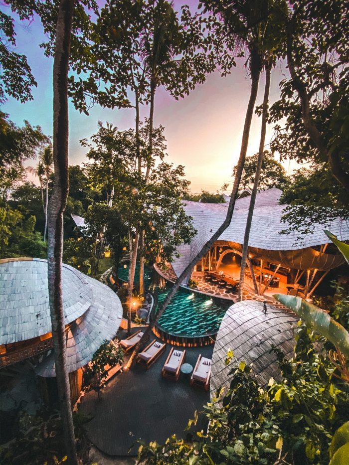 位于巴厘岛的内陆,这个健康疗养院已被整合到一个森林中,一边是茂密的稻田,另一边是一条引人注目的河流。这条河汇集了整个地区的水,形成了一个小瀑布的交界处,产生的水流足以为水力发电机供电,可以维持建筑群内的电力。在设计方法上,与自然的融合一直是最重要的,不仅仅是通过其操作,而是通过使用直接在现场和附近地区找到的材料,因此使度假村成为完全的碳零。