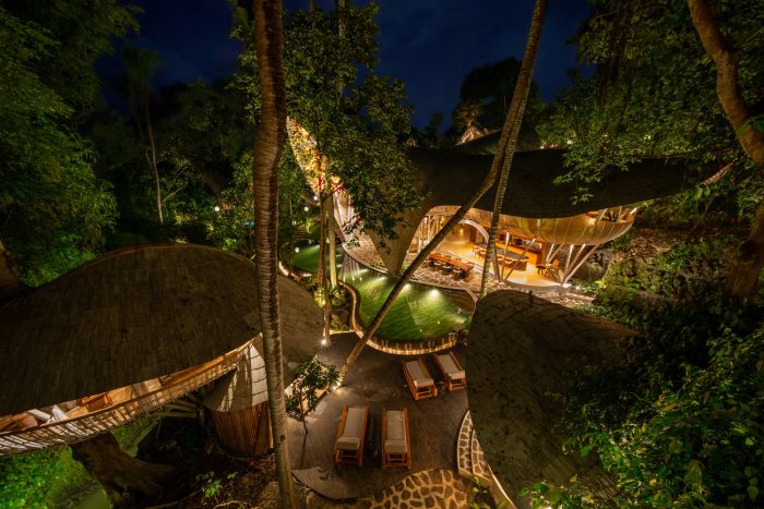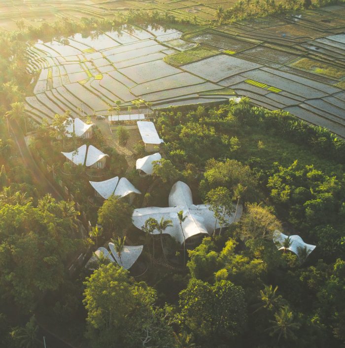 Located inland in Bali, this wellness retreat has been integrated into a forest that borders luscious rice fields on one side and a dramatic river on the other. The river converges water from the whole area creating a junction of small waterfalls that produces enough flow to power a hydro electric generator that can sustain the power of the buildings within the complex. Merging with nature has been at the forefront in the approach to the design, not just by its operation but by using materials found directly on the site and the immediate locality, therefore enabling the resort to become fully carbon zero.
