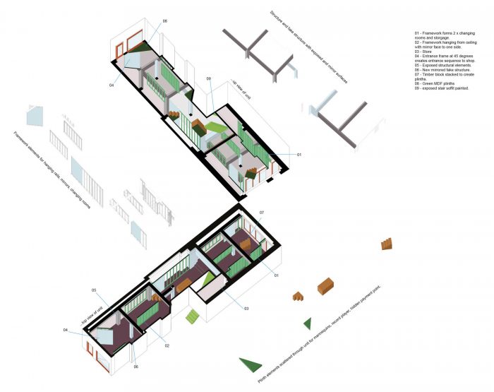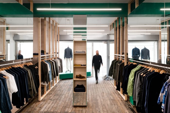 The existing concrete structure, long since concealed and covered by previous tenants, has been brought back to life in a vibrant green, reminiscent of the mills and factories which have been such an influence on Universal Works collections. Large expanses of the mirror have been used, mounted to bespoke timber framework, to create illusions of volume and new sightlines through the space. An original blockwork wall has been resurrected in green machined Valchromat as the changing room walls and doors.