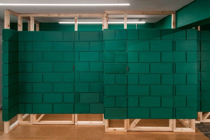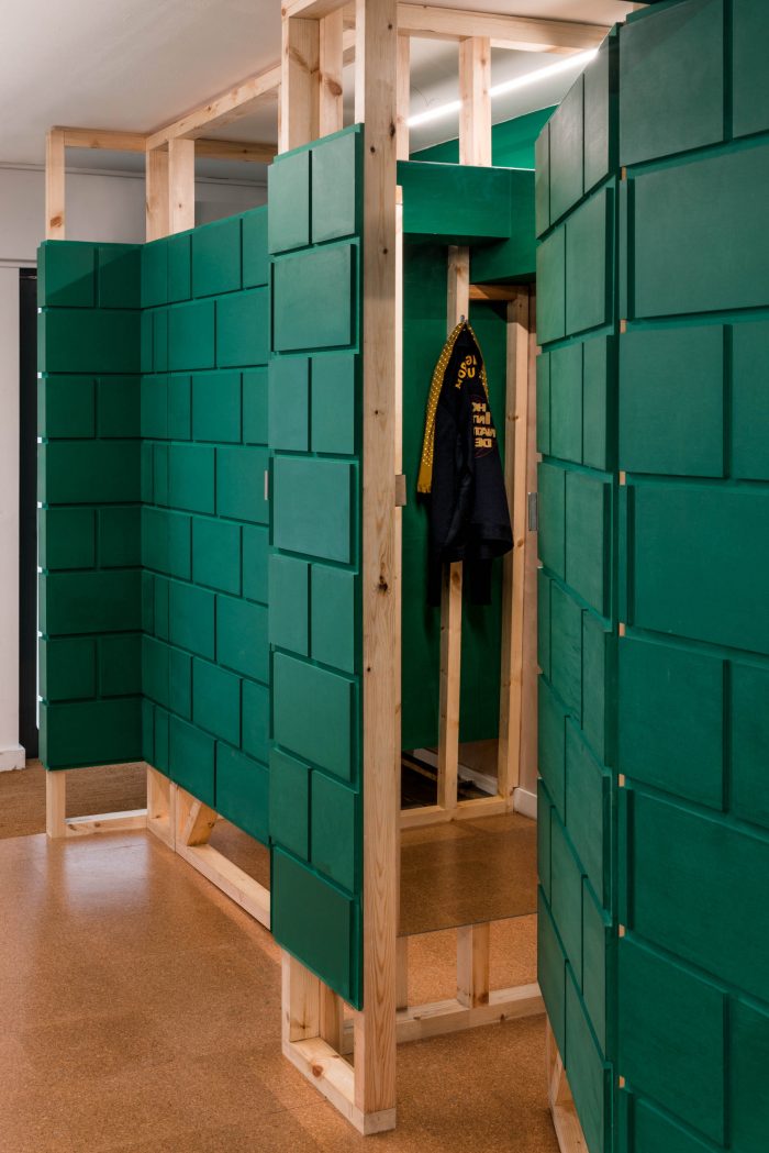 现有的混凝土结构早已被以前的租户掩盖了,它被重新赋予了鲜艳的绿色,让人联想到对Universal Works系列有如此影响的磨坊和工厂。大面积的镜子被用来安装在定制的木材框架上,以创造体积的幻觉,并通过空间创造新的视线。一面原始的石板墙被重新用绿色机械加工的Valchromat作为更衣室的墙壁和门。