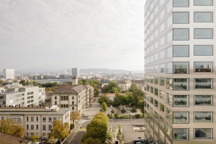The chrome and glass facade refers to the technology inside the building. In the structural design, only the facade columns, the building services and the four cores in the tower are load-bearing. The horizontal forces are transferred via frames in the form of Vierendeel trusses. By combining the façade columns with the four cores, the building abandons the conventional solution for high-rise buildings in favor of a floor plan that is as open as possible in the center, allowing great freedom in the division of the various floor levels.