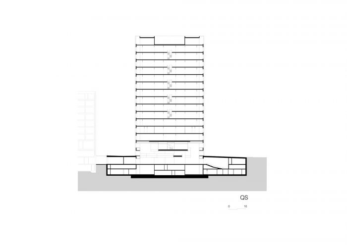 The top ten floors are dedicated to scientific research. Each floor can accommodate four research departments connected by a common meeting room. Adjacent floors are connected by an open stairwell and meeting zone that serve scientific exchange, interdisciplinary research, and innovative ideas that arise from chance discussions.