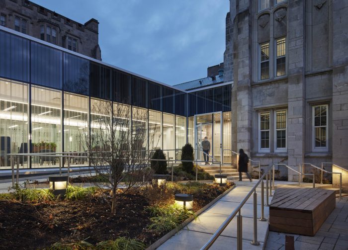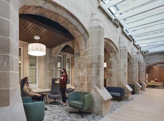 The overall concept for the project is ‘A Delicate Touch,’ which refers to both the way the new structure engages with the existing building, as well as how students are cared for at the wellness center. The new infill is gently inserted into the existing courtyard and separated with a continuous band of skylights so that no portion of the new construction directly bears on the historic hospital facades.