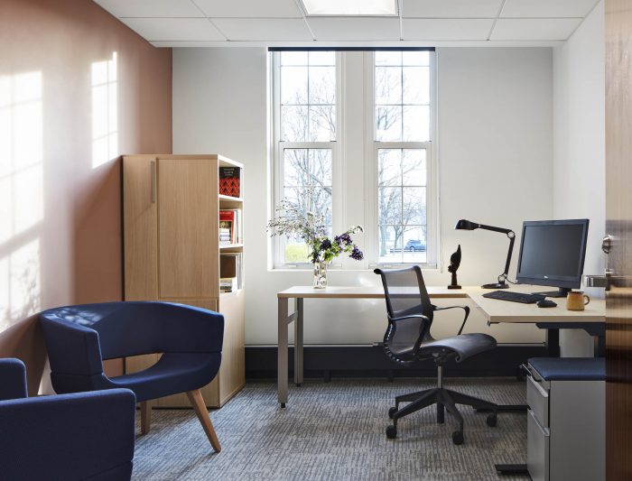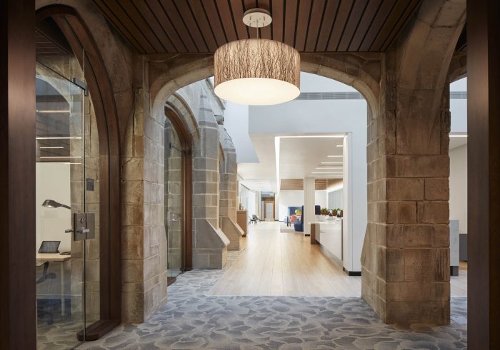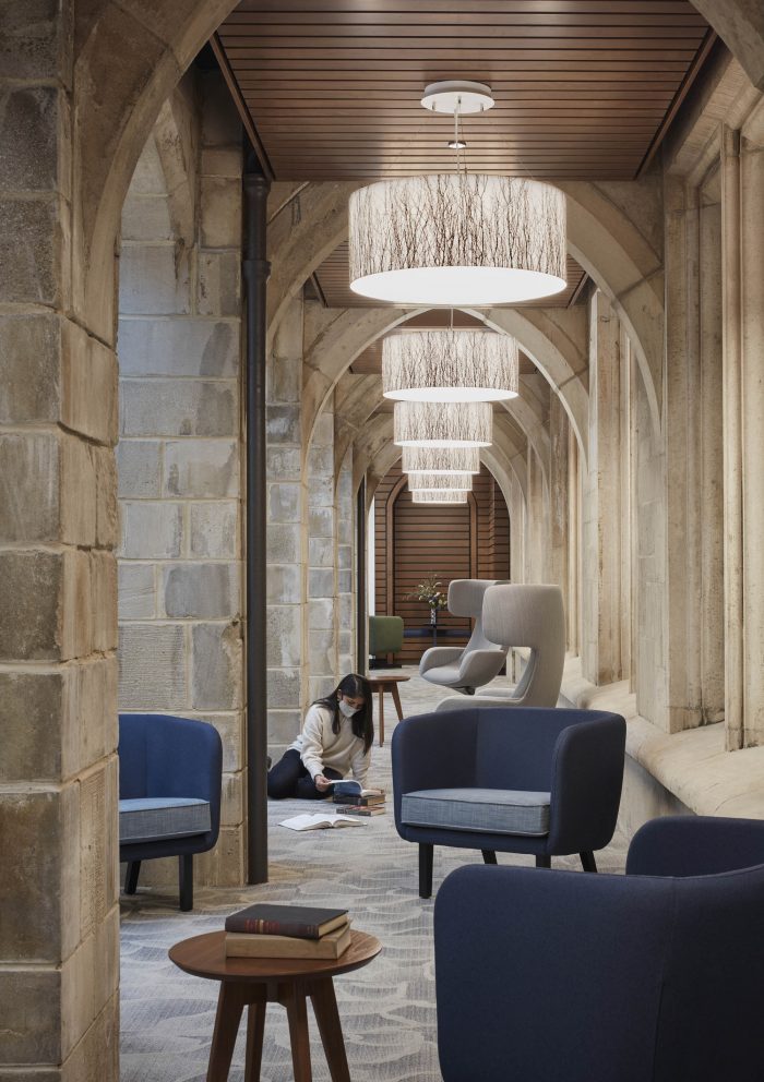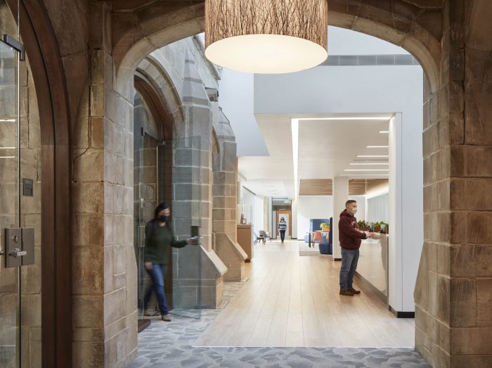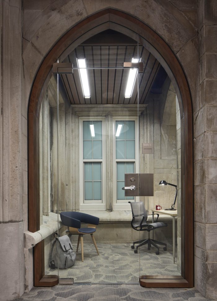 An interior glass wall separating a multipurpose room from the main lobby becomes a secondary façade and features a birch tree forest graphic, relating to biophilic design principles, as well as providing visual privacy. A second cloister element contained within the original historic courtyard was captured in the new addition as student space. These skylit gothic niches are repurposed as private nooks where students can choose to wait or study prior to an appointment.