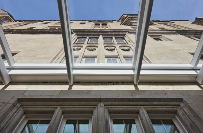 为了避免破坏历史上现有结构脆弱的石灰石外墙,支撑天窗组件的钢架从庭院周边的内部建筑中悬挑出10英尺,仅与旧的哥特式外墙相撞。在新的主入口处有一面全高的玻璃墙,通过原来街道上的回廊的开放式石拱门可以看到,目的是为了反映周围的景观院落。