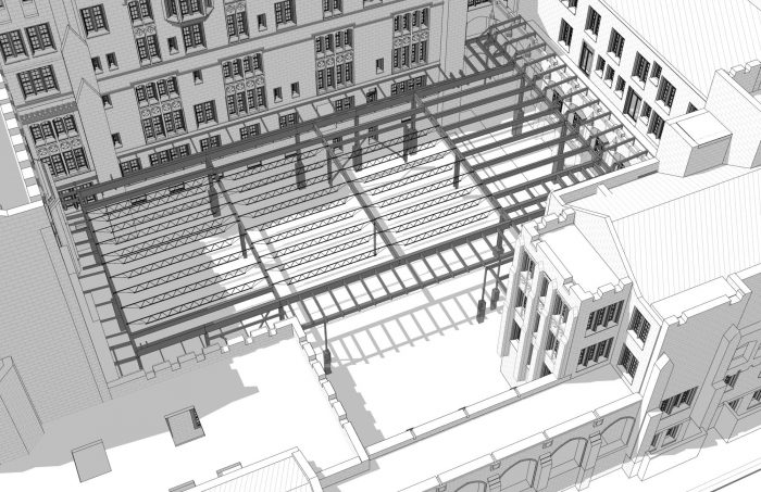 To avoid damaging the fragile limestone facades of the historic existing structure, the steel frame supporting the skylight assembly was cantilevered 10’ from the interior construction around the perimeter of the courtyard and merely flashed to the old gothic facades. A full-height glass wall at the new main entrance is visible through the open stone arches of the original street-level cloister and is meant to reflect the surrounding landscaped courtyard.