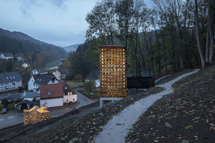 The upper part is made out of wood, from which the half-timbered houses in the Sauerland were once built. On the one hand, it serves as a roof and on the other hand as a central luminous element for the dark hours.