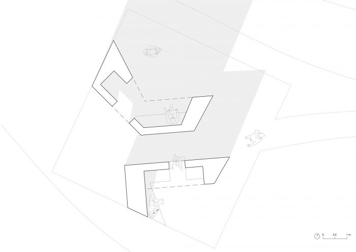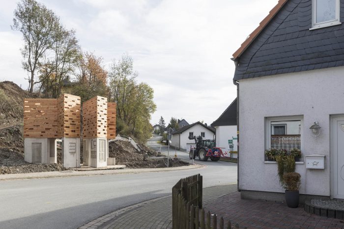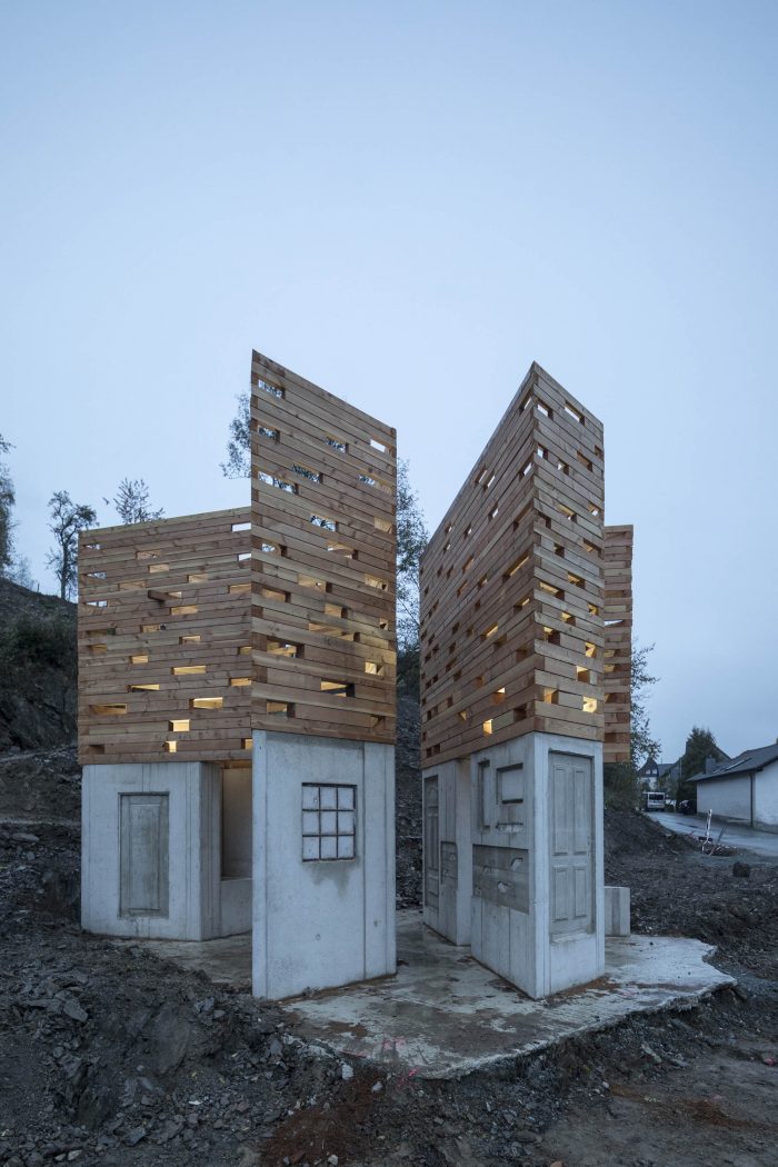 Unterholz Installation. This installation is located on the multigenerational square of Referinghausen. In the lower part, seating possibilities for the young and elderly have been cut out from two concrete cubes. During the manufacture, the villagers attached old windows, doors, and memorabilia to the concrete formwork in order to leave a permanent imprint for future generations.