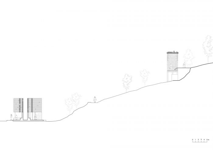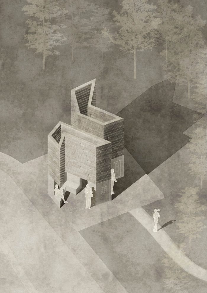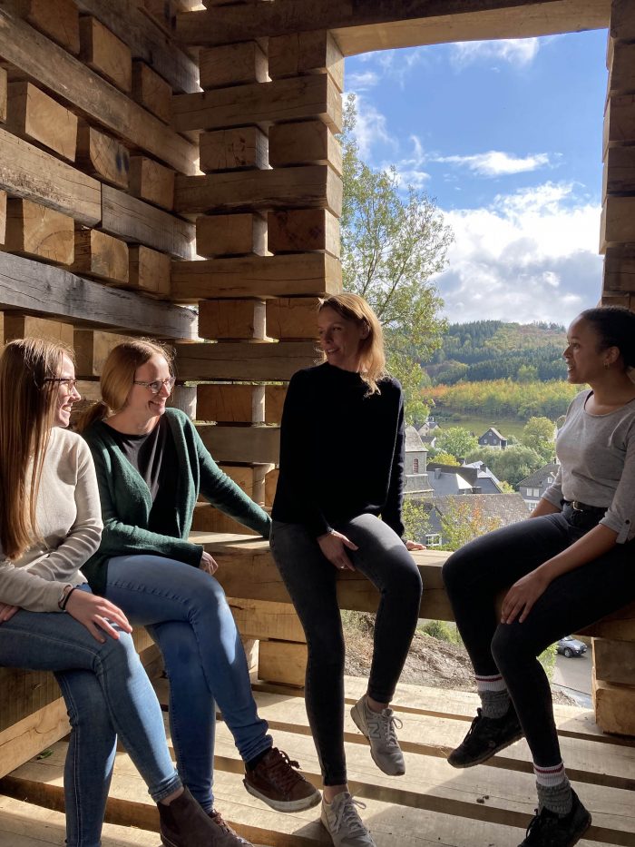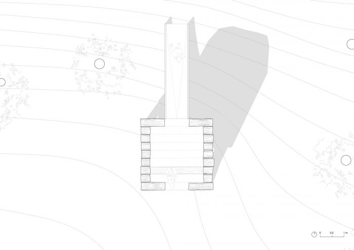 Oberholz Installation. The Open Mind Place Oberholz is located 20 meters above the neighboring Unterholz installation. Oak sleepers were stacked on a sub- structure of six concrete pillars to form a building for coming together. The interior is accessible via a small bridge and offers space for up to six people.