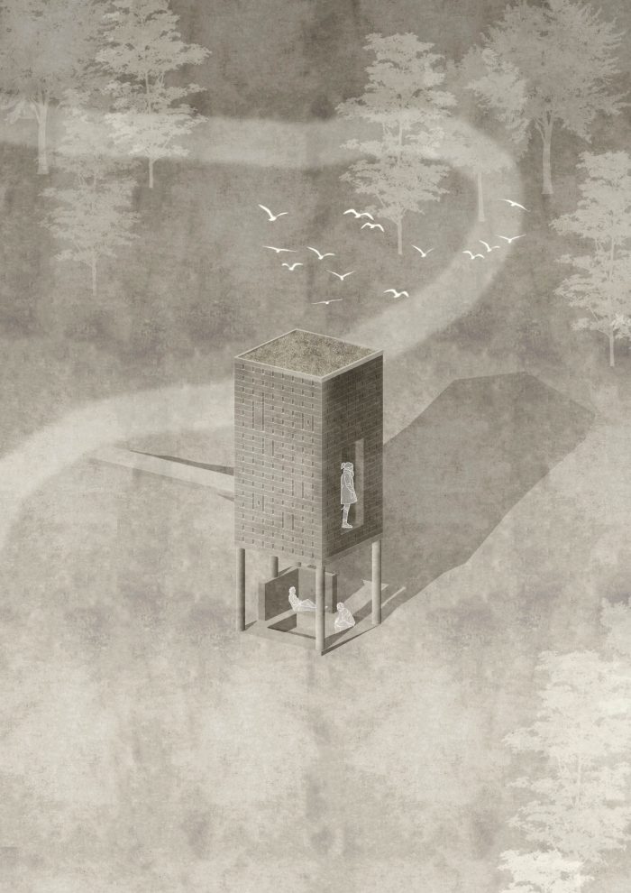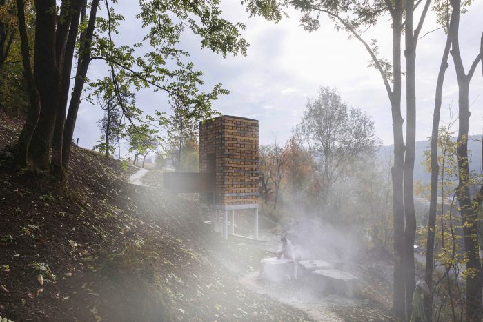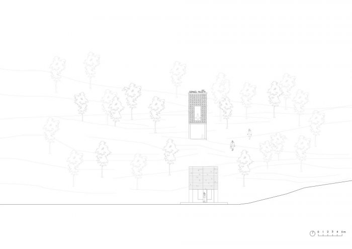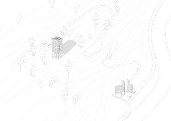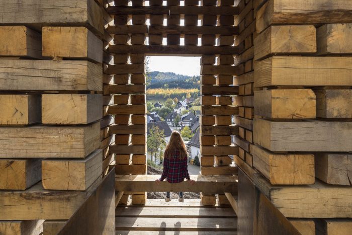 奥伯霍尔茨装置。Open Mind Place Oberholz位于邻近的Unterholz装置之上20米处。橡木枕木被堆叠在一个由六根混凝土柱子组成的子结构上,形成了一个聚集的建筑。内部可通过一座小桥进入,并提供多达6人的空间。