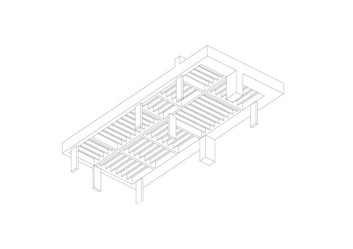 The main structural order is composed of beams of great expression in the longitudinal and transversal directions that mark loosely defined spaces of the house. Each of these spaces is defined by a set of secondary beams that are always organized according to the smallest span. These beams are eleven centimeters thick and with little spaces in-between them, and they define the character of each space and reduce the roof slab to a compression blade, with a thickness of eight centimeters. The roof and ceiling slab fulfills a whole structural function, not only in a mechanical sense but simultaneously in its spatial components, from an architectural and functional perspective.