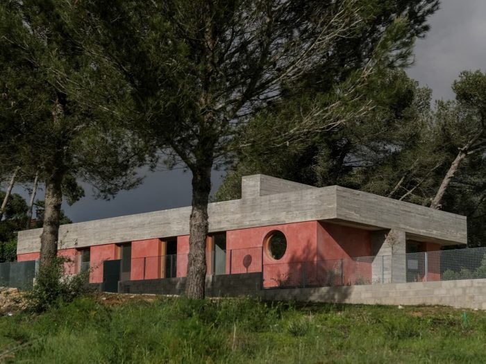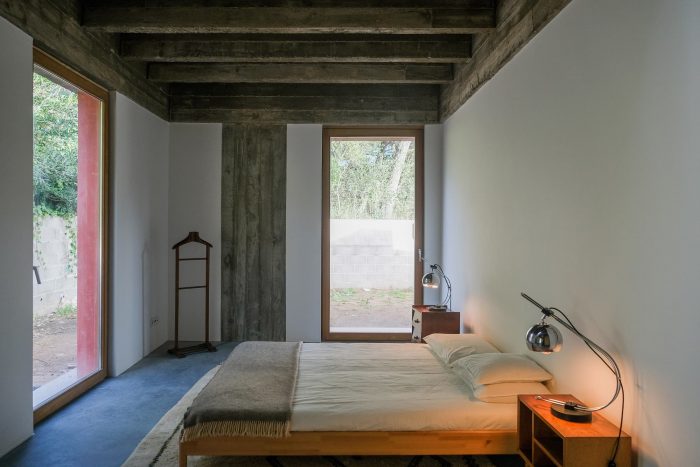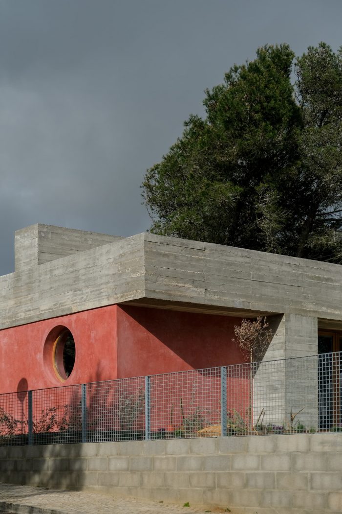 The materials themselves express their natural condition and it is in this context that they seek a dialogue with each other. The concrete appears in its primitive state, through the raw pine concrete shuttering (formwork) while the wood expresses its natural color and texture both in the interior furniture and in the frame openings. On the external walls, pigmented lime was used, with a reddish color and a smooth finish, which varies in tone depending on the natural light and creates a contrast with the raw and textured concrete. The meaning of the concrete structure as a primary and permanent and of the limed brick walls as a secondary and modifiable structure is underlined.