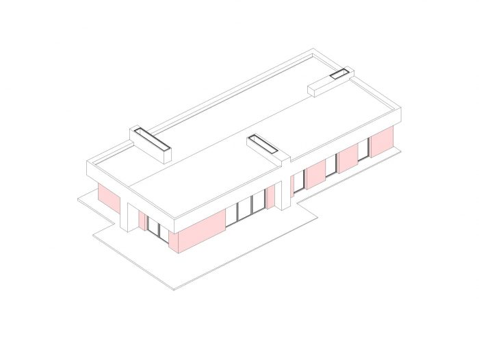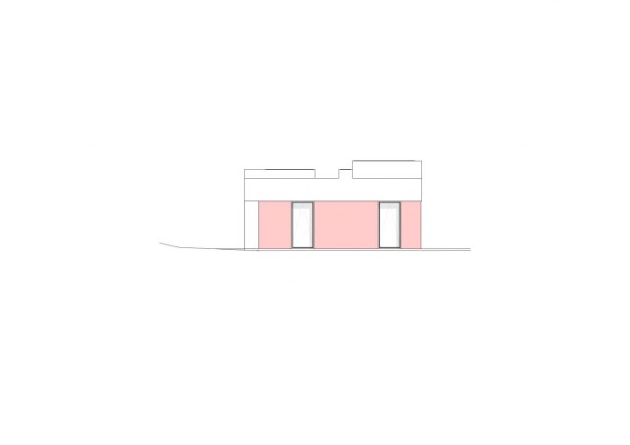 On the outside there are three volumes that extend from the roof level, the roof lights extend upwards and enable light to be fed to the interior of the house, and two massive concrete elements on the south and east facades, that extend downwards, which are responsible for collecting the water from the roof.