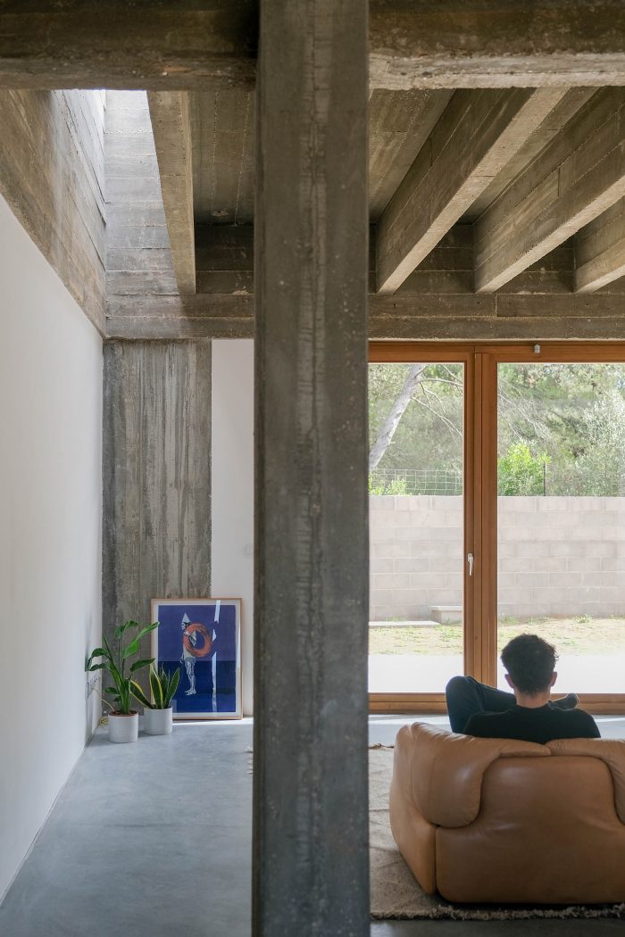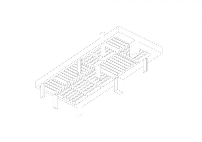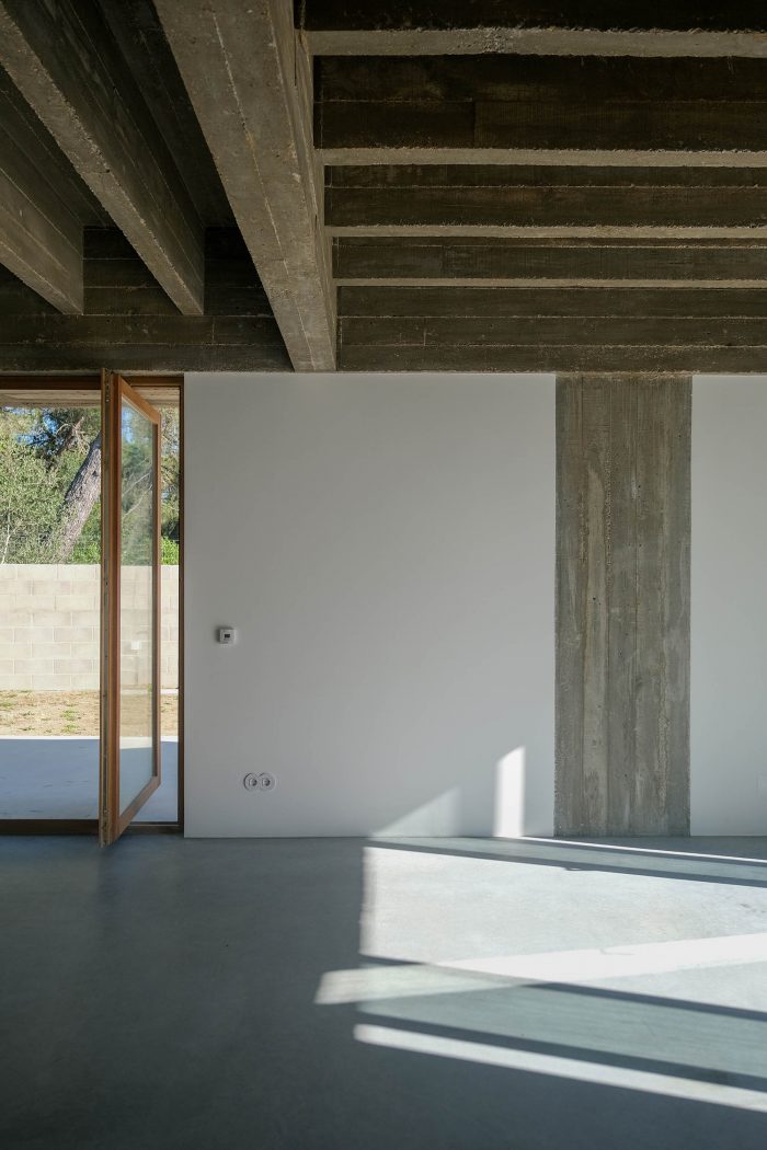 The main structural order is composed of beams of great expression in the longitudinal and transversal directions that mark loosely defined spaces of the house. Each of these spaces is defined by a set of secondary beams that are always organized according to the smallest span. These beams are eleven centimeters thick and with little spaces in-between them, and they define the character of each space and reduce the roof slab to a compression blade, with a thickness of eight centimeters. The roof and ceiling slab fulfills a whole structural function, not only in a mechanical sense but simultaneously in its spatial components, from an architectural and functional perspective.