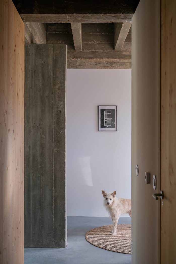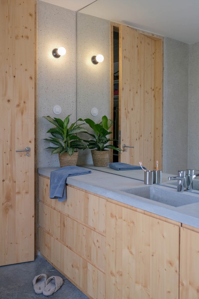 The materials themselves express their natural condition and it is in this context that they seek a dialogue with each other. The concrete appears in its primitive state, through the raw pine concrete shuttering (formwork) while the wood expresses its natural color and texture both in the interior furniture and in the frame openings. On the external walls, pigmented lime was used, with a reddish color and a smooth finish, which varies in tone depending on the natural light and creates a contrast with the raw and textured concrete. The meaning of the concrete structure as a primary and permanent and of the limed brick walls as a secondary and modifiable structure is underlined.