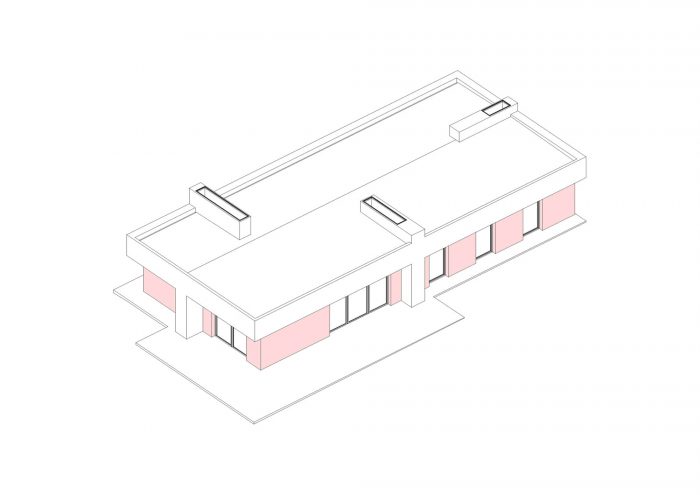On the outside there are three volumes that extend from the roof level, the roof lights extend upwards and enable light to be fed to the interior of the house, and two massive concrete elements on the south and east facades, that extend downwards, which are responsible for collecting the water from the roof.