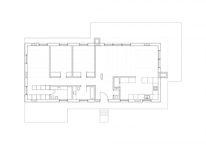 在外面有三个从屋顶延伸出来的体量,屋顶灯向上延伸,使光线能够进入房屋内部,在南面和东面有两个巨大的混凝土元件,向下延伸,负责收集屋顶的水。