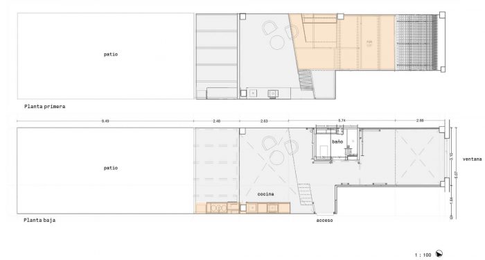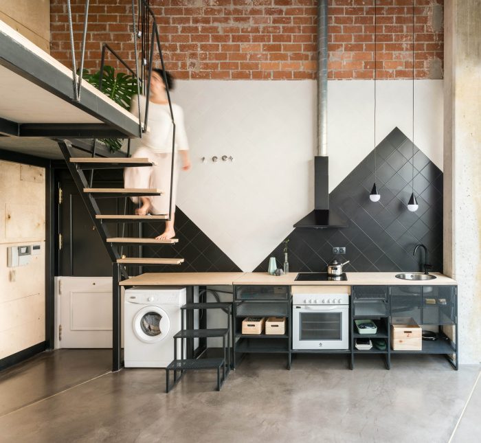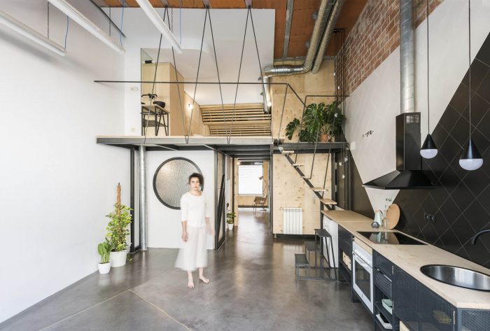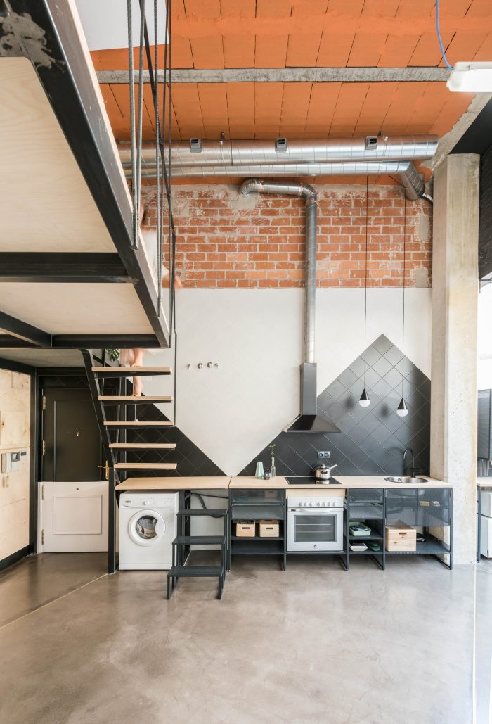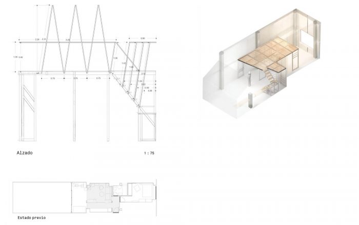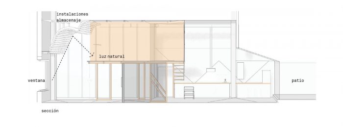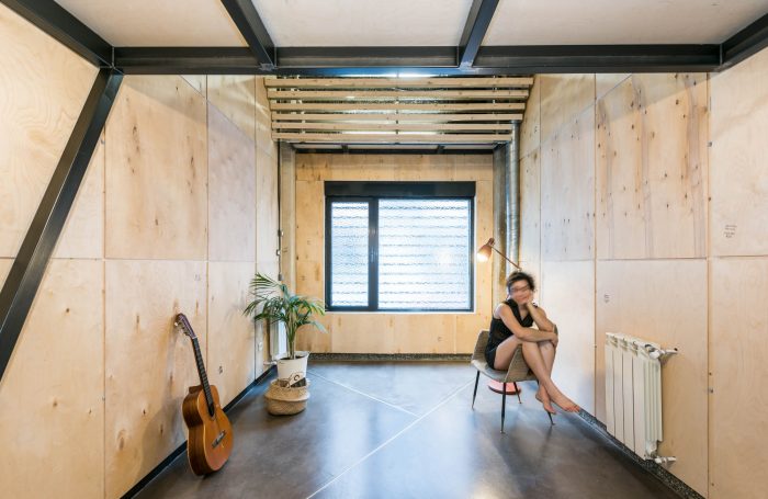 The new level is built on top of this central room of the apartment, leaving two double-height spaces in each side of it. One bigger and public in the east side and a smaller and more private one in the west side. The new upper floor divides the apartment into two spaces, a private and a public function. The choice of materials for these two spaces reflects this duality. On one hand, in the private vaulted area the walls and doors are covered with recycled plywood (from old electronic equipment containers). On the other hand, white walls reflect light from the patio to fill the kitchen, living room and recreational space with light. The use of materials is minimized, avoiding unnecessary finishes.