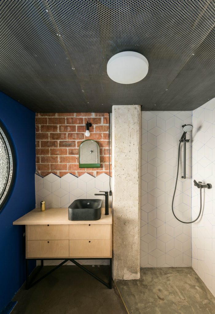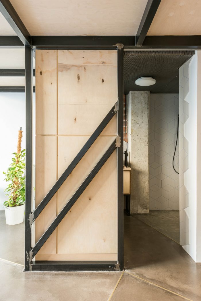 新的楼层建在公寓的这个中心房间的顶部,在它的每一侧留下两个双层高度的空间。一个更大的公共空间在东侧,一个更小的私人空间在西侧。新的上层将公寓划分为两个空间,一个是私人空间,一个是公共功能。这两个空间的材料选择反映了这种双重性。一方面,在私人的拱形区域,墙壁和门都用回收的胶合板(来自旧的电子设备容器)覆盖。另一方面,白色的墙壁反射来自天井的光线,使厨房、客厅和娱乐空间充满了光线。材料的使用被最小化,避免了不必要的装饰。