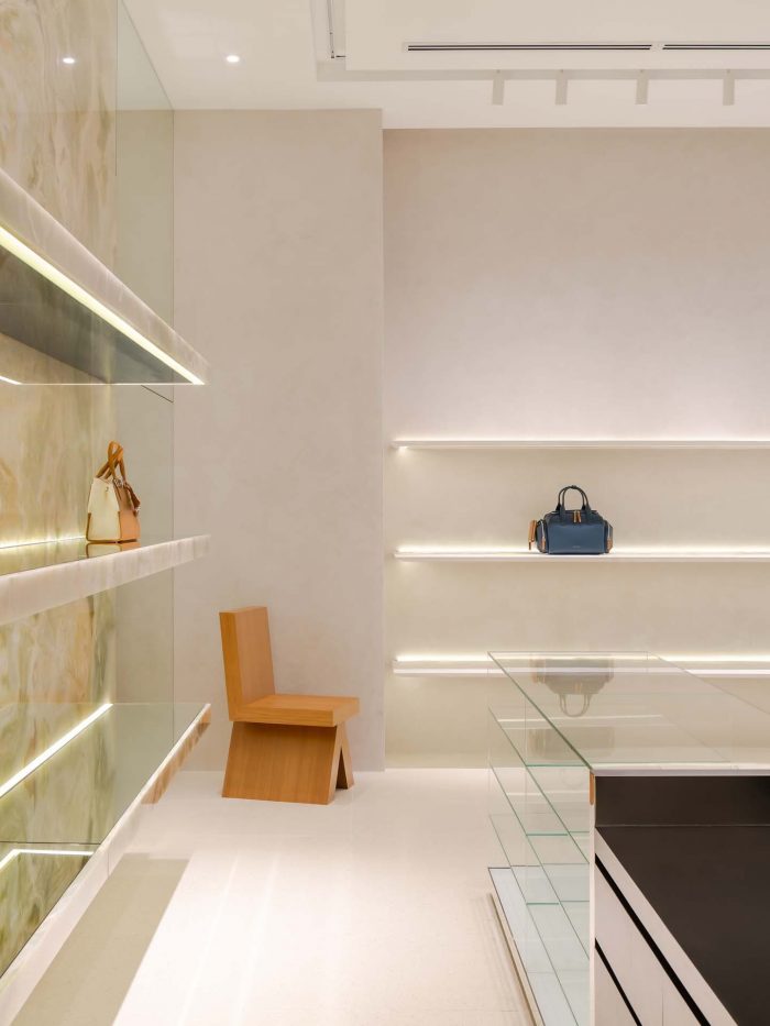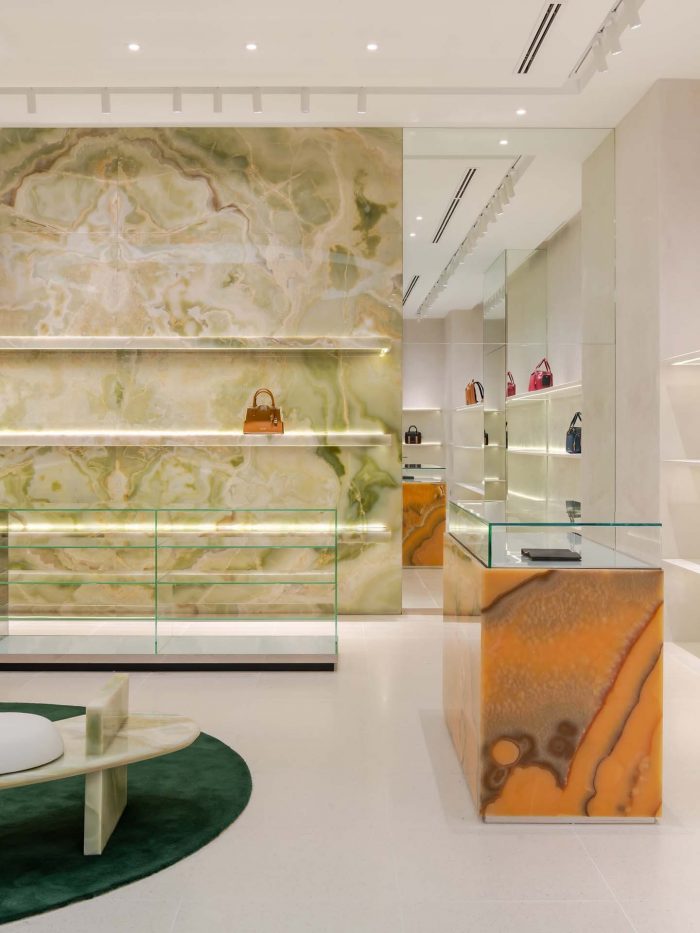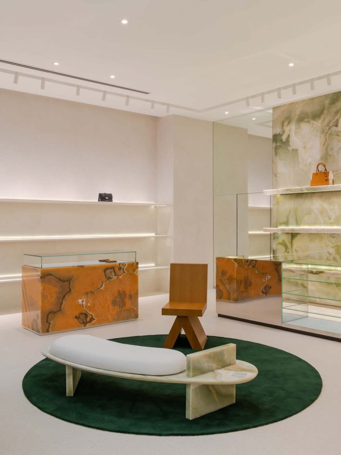 A pair of matching green jade marble-clad counters with glass vitrines display small leather goods at the front of the store. Its natural green grains provide a visual connection with the rest of the biophilic-themed space. Further in, orange onyx display counters add punchy accents to the store.