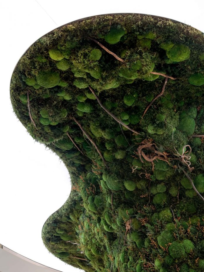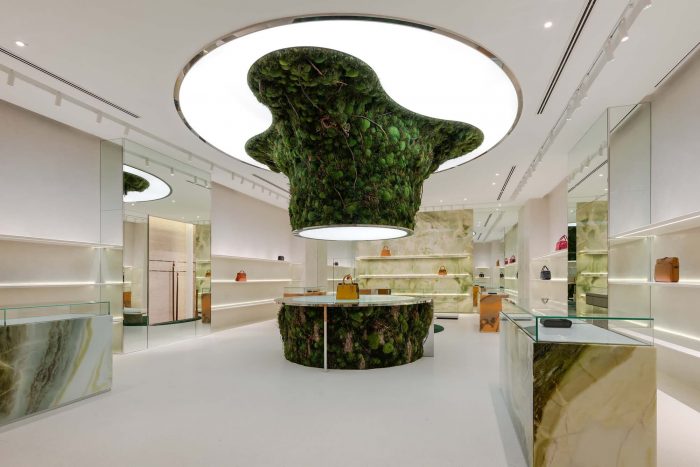 Eschewing the traditional concept of luxury in favor of a maximal minimalism approach, the centerpiece of the space is an abstract interpretation of a living tree sprouting from the floor through to the ceiling, like an experiment growing in a sci-fi lab. The moss-covered installation’s organic silhouette creates a calming contrast with the open plan layout of the store that aims to merge architecture with sculpture, giving a unique identity to the space.