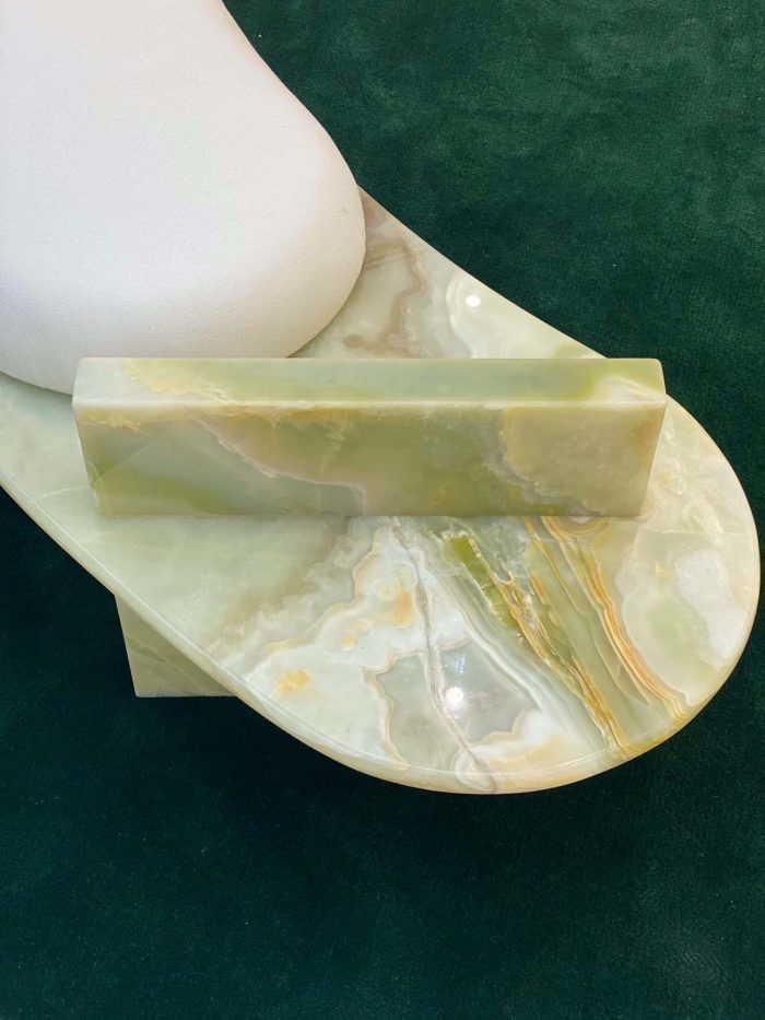 The serene green onyx feature wall which sits at the end of the store is accompanied by a display counter constructed entirely out of clear glass. Two bespoke pieces of furniture were designed for the waiting area for customers; a long curved bench fabricated out of the same green onyx and an oak armchair. Through artistry and nature, the elegant and futuristic aesthetic redefines the future of the brand’s in-store retail environment into an immersive, engaging, and compelling experience.