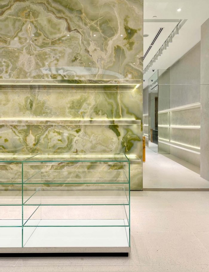 Against a base of pale plaster walls which is used throughout the space, a composition of precious stones with onyx walls and counters takes center stage drawing focus to the displays and allowing the products to stand out to shoppers.