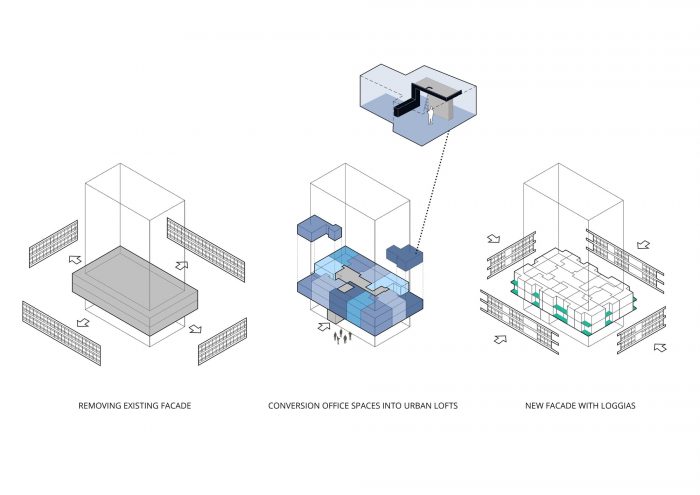 The existing facade of these levels with office spaces underneath the buildings were outdated and are renewed with respect to the characteristics and structure of the original design. As an addition each loft apartment is provided with a loggia.