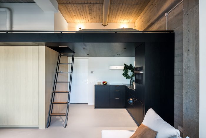 Focus of the main design concept for the interior of the lofts is the introduction of a 3D interior object containing a kitchen, a bathroom, storage space and a mezzanine with a double bed. The quality of the raw concrete structure of the existing building contrasts with the refined wooden interior objects. The co-existence of these different materials and textures captures the past and the present into a harmonic design which is both industrial and luxurious.