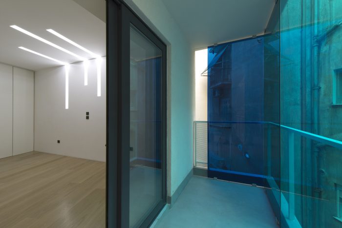 Filtering necessary but unwilling views to those totally neglected back facades was one very important task that we had to do. Using colored laminated glasses we proposed a different view to these urban ruins, which suddenly became interesting.