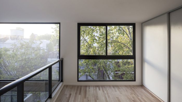 On the upper levels, the duplex units are connected by double-high space. In addition to this, a 2 meter retraction frees up the airspace and spatially connects the terraces of the building.