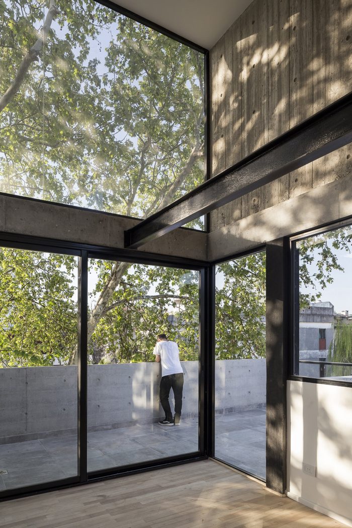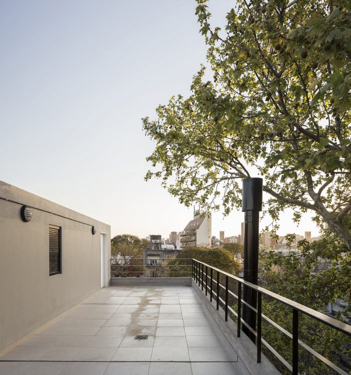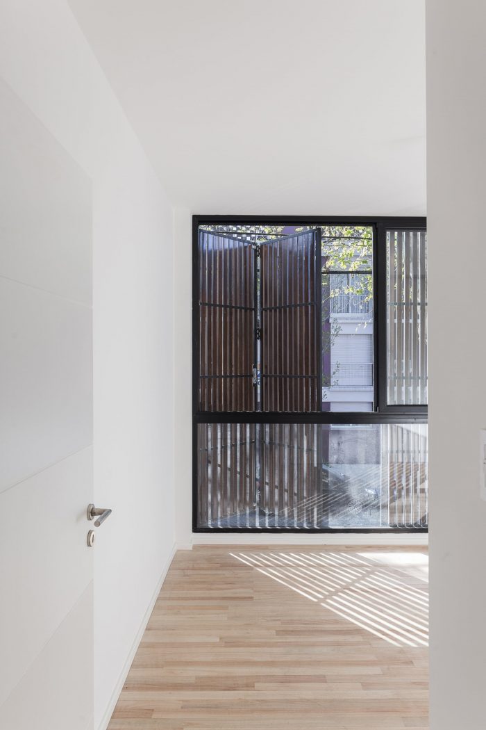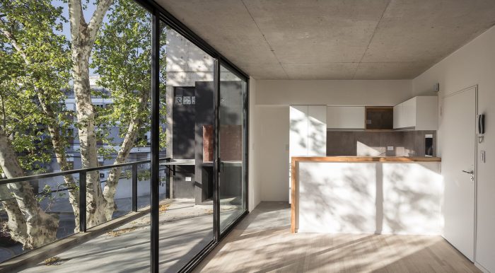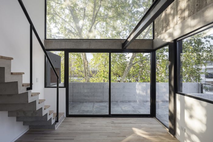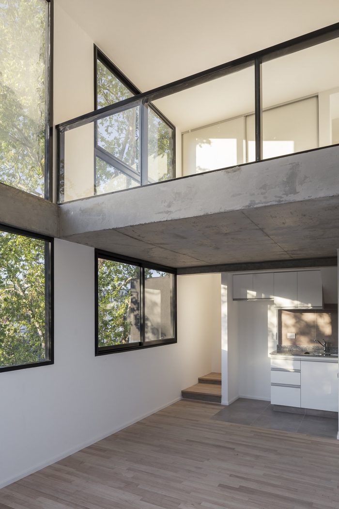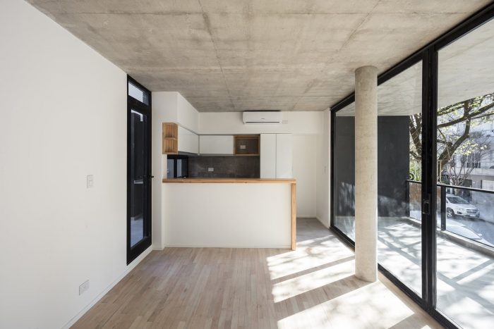 The interiors preserve the material synthesis by creating wide and neutral spaces, where natural light stands out by the use of white walls and kitchen cabinets, and the light wood floors, in contrast to the concrete ceilings and walls.