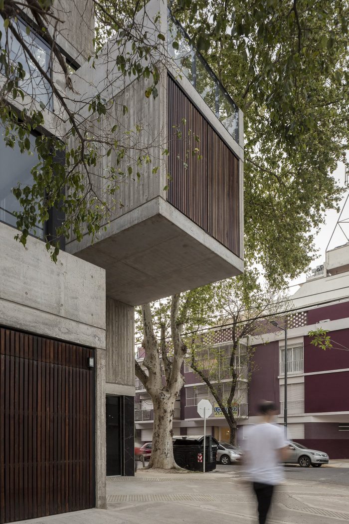 一个令人印象深刻的 "混凝土盒子 "在拐角处飞起4米高,强调了建筑的入口,通过在底层的回缩获得其最终形状。