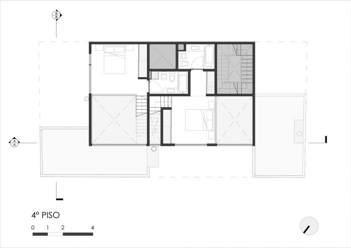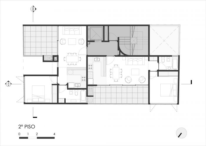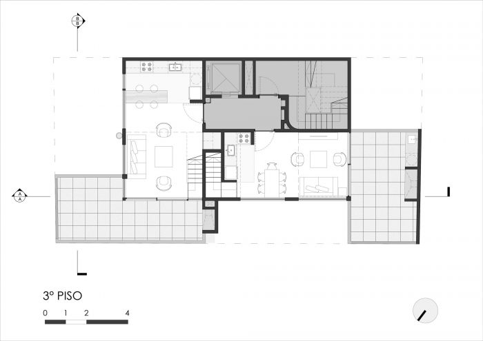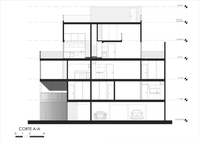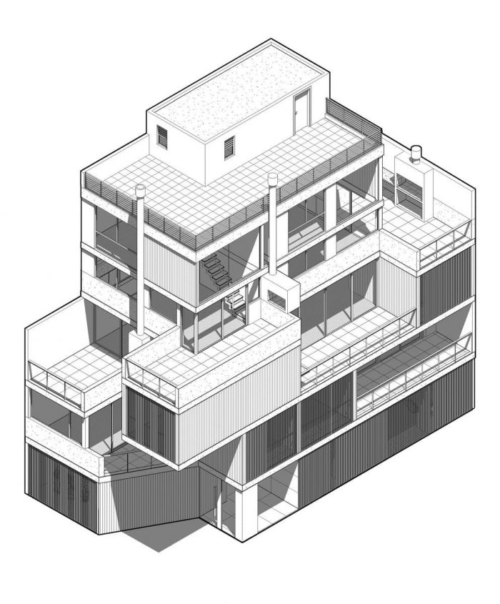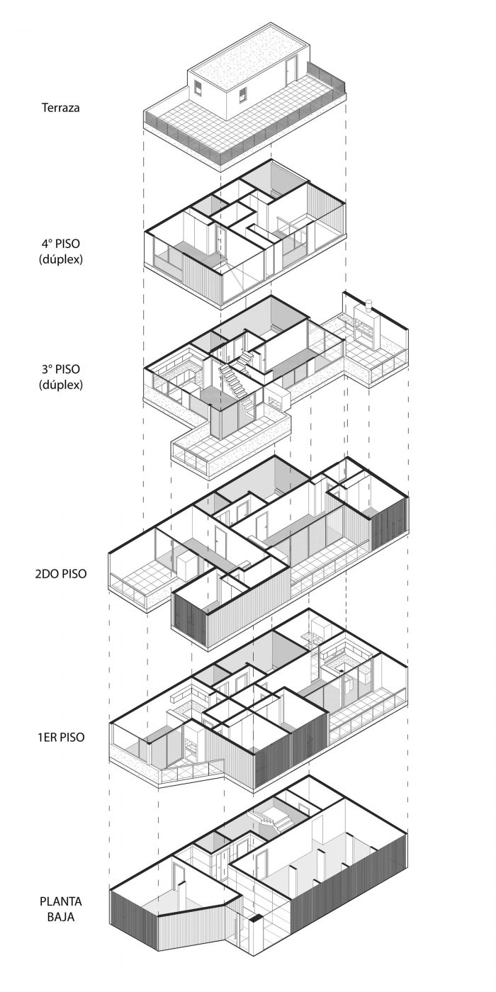 In order to achieve this, “L- shaped’ housing typologies are introduced in the first levels, which when combined, stacked and mirrored, they generate a series of exterior spaces that are used by the units.