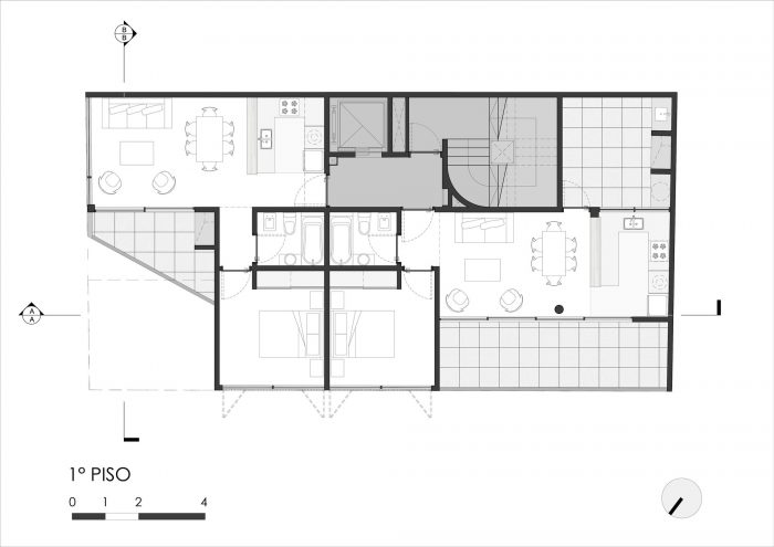 在上层,复式单元由双层高的空间连接。除此之外,2米的回缩释放了空气空间,在空间上连接了建筑的露台。