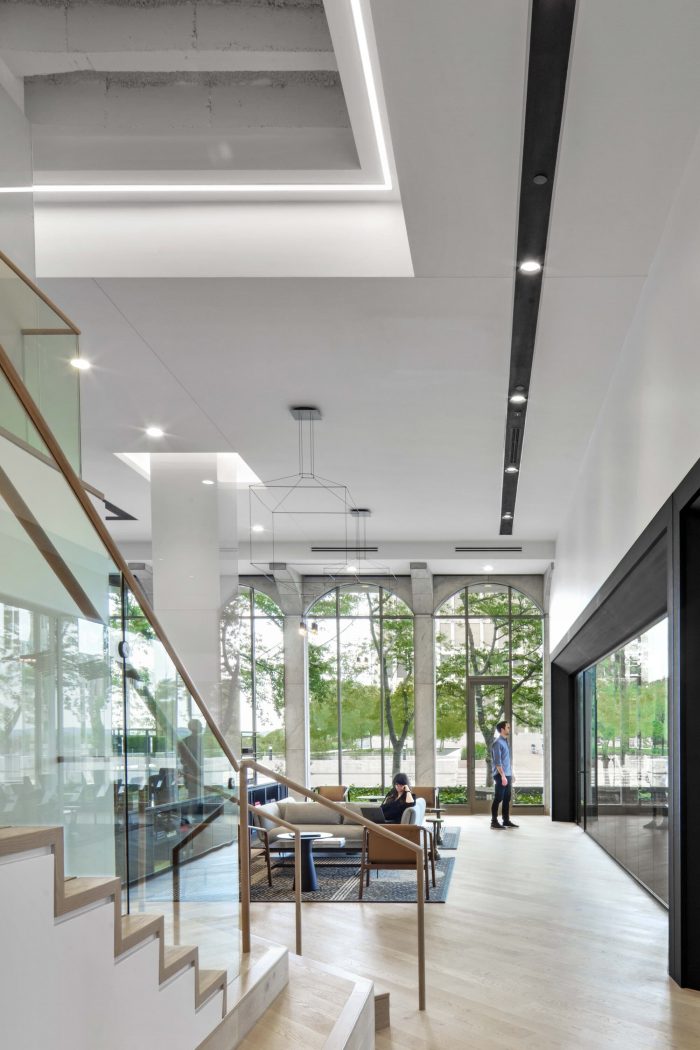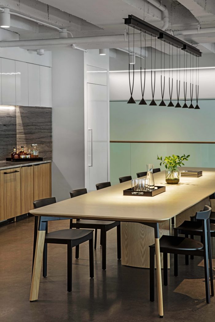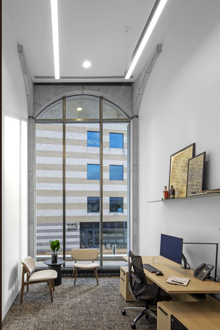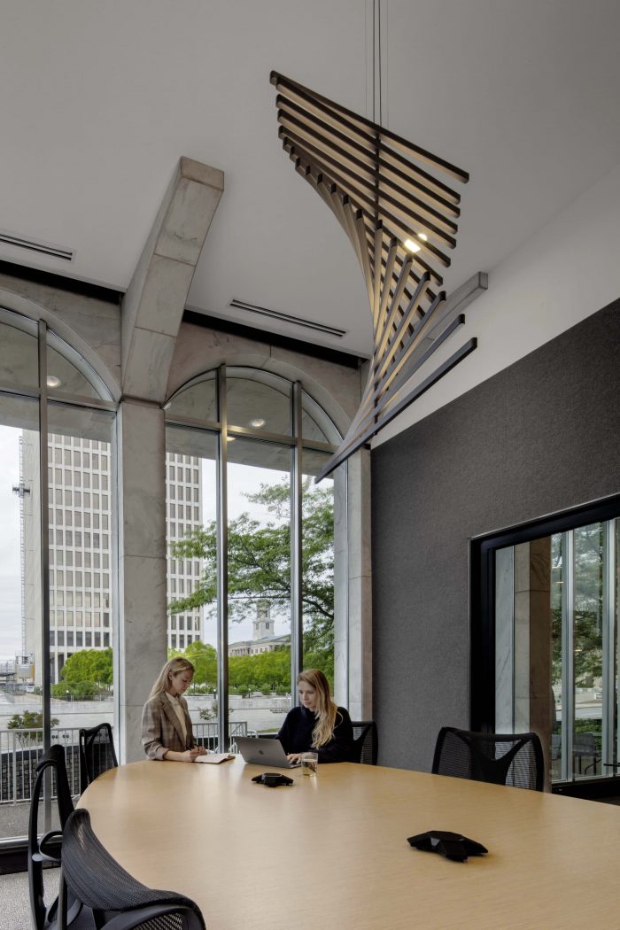 On the first floor, custom black-stained “picture frame” millwork surrounds the glass system—a nod to the stage proscenium. The largest meeting room anchors the northeast corner of the first floor. The elliptical shape of the black-stained Halcon table mimics the curvilinear form of the 16’ marble-clad arched windows. An articulated Vibia light fixture resembling sound waves serves as a focal point above the table. Acoustical gypsum ceilings and ribbed wallcovering provide acoustical privacy for digital presentations and virtual conferences.