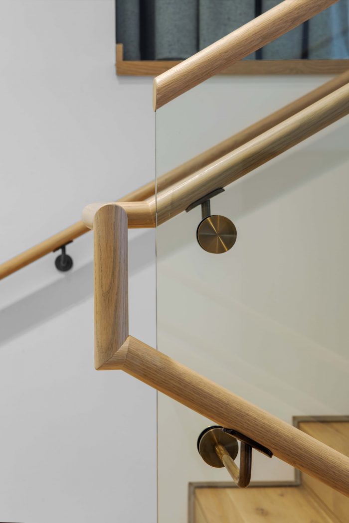 The mezzanine takes advantage of the 19-foot-high ceilings of the first floor, offering employees a space to gather for lunches, celebrations, and awards show watch parties. Agent offices, a wellness room, and phone rooms are tucked underneath making the most of the void space. A monumental oak stair acts as the main circulation point up to the mezzanine—positioned to encourage employees to take the stairs whenever possible.
