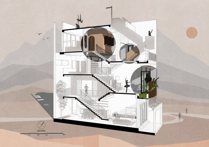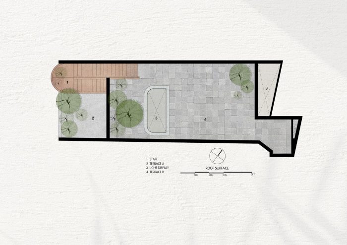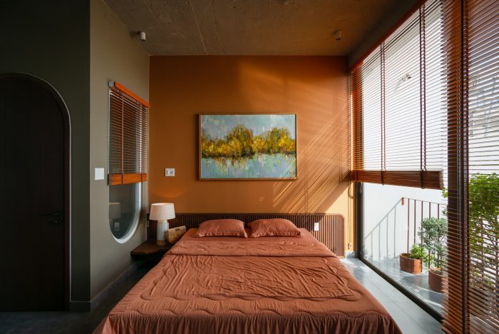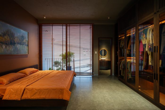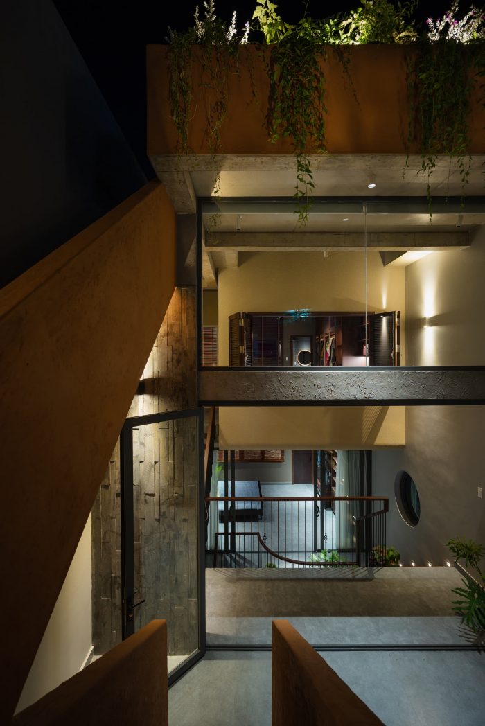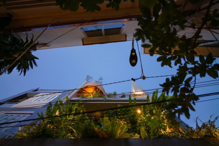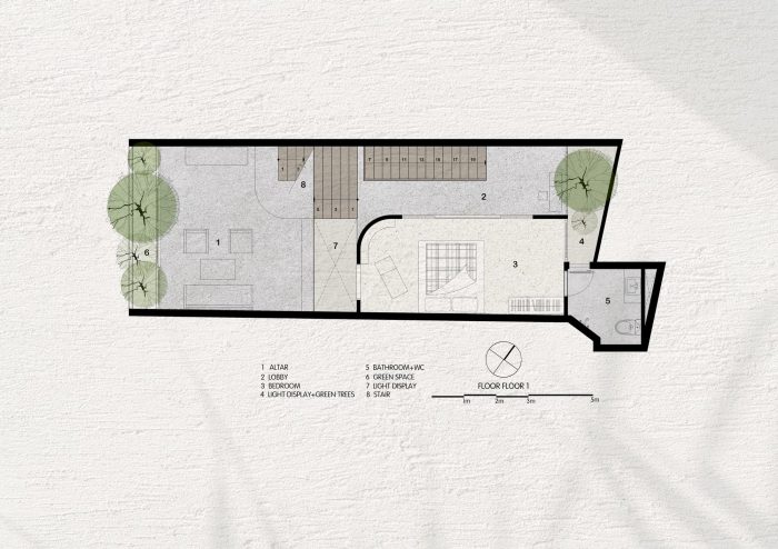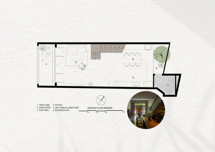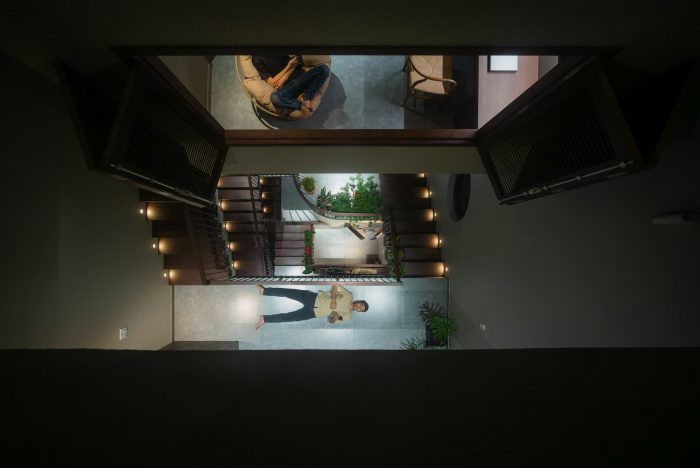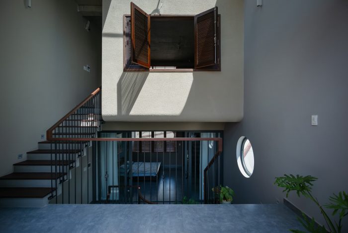 Uyen House is fortunate to have a larger area than other houses in the alley. The distribution of the space structure in the house is always towards the simplest, just enough space for the space to be used, the connecting voids, light, wind convection, and trees are the most needed at Uyen House. The floor plan of our house is arranged according to the height of the floor difference to estimate the distance between the spaces. Not individually fixed by walls for certain brain rooms, but maximized in the house by large doors, atriums in the middle and at the end of the house, have formed the light penetrates the house according to the changing time of day. The house almost does not need to use equipment when it is hot, because the wind convection in the air and the winds running through the room in the atrium shafts, the middle position, behind the house, and the front is always the moving point of the house. wind direction.