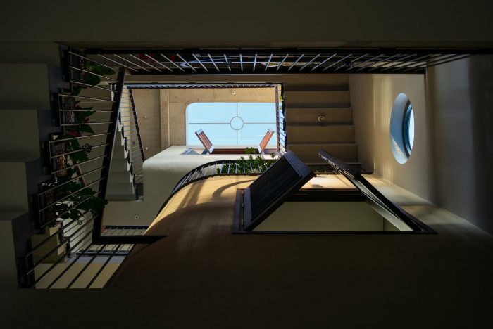 房屋的主立面在西南方向,所以午后的阳光照耀在晴朗而炎热的立面上,所以在正面位置,我们安排了一层绿色的树木,以减少阳光、热量和空气中的细小灰尘。同时,树木也为房屋带来了舒适感,帮助房屋与自然融为一体。空间的尽头是通往露台的楼梯系统,楼梯上的交通位置安排了绿色的花盆,帮助业主在移动时更多地与自然联系。