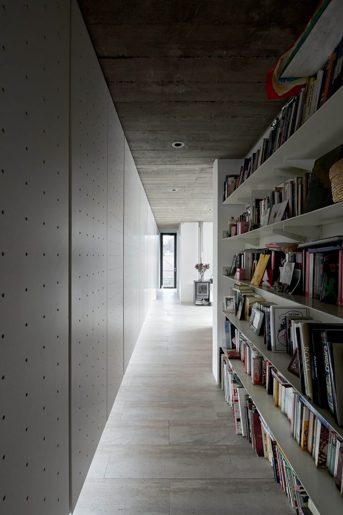 The materiality of the house is a mix of concrete in the new walls and in the slab of the interior, travertine pavement in all the house and corten steel and aluzinc revetment for the exteriors in all the facades that are ventilated in order to increase the insulation of the house.