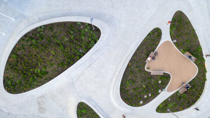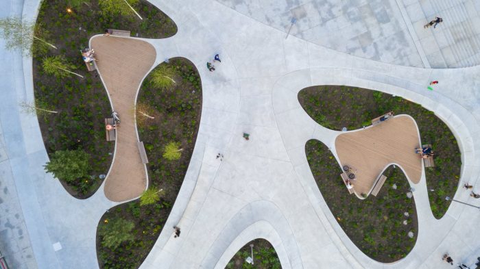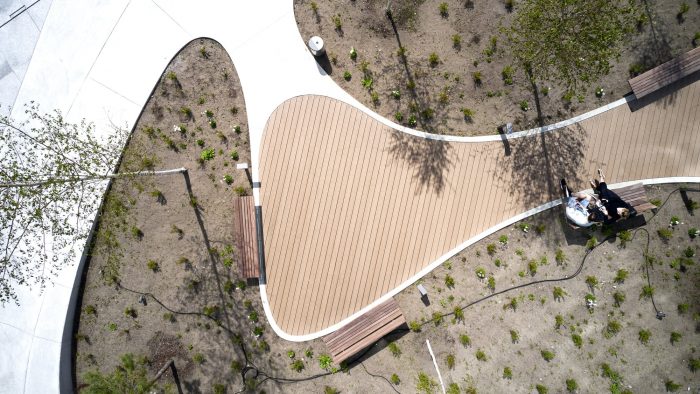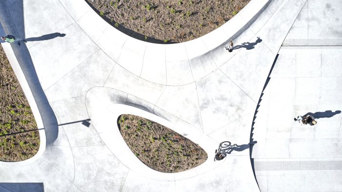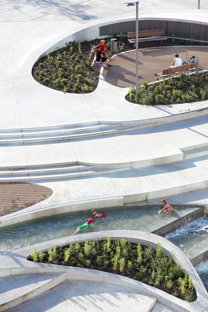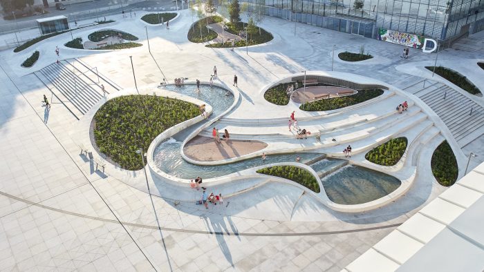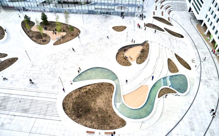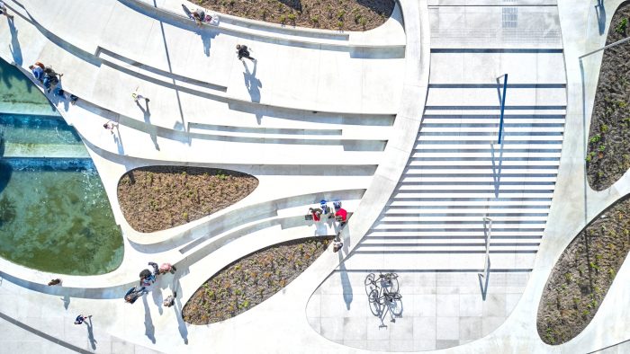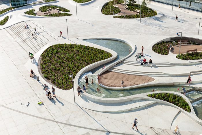 What was previously a largely unused space adjoined by historical buildings is now becoming a new, inviting public amenity where you can casually enjoy a coffee in your lunch break or get some work done outdoors while children play in the water, young people skate and students relax in the sun…
