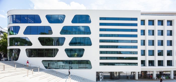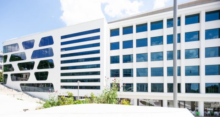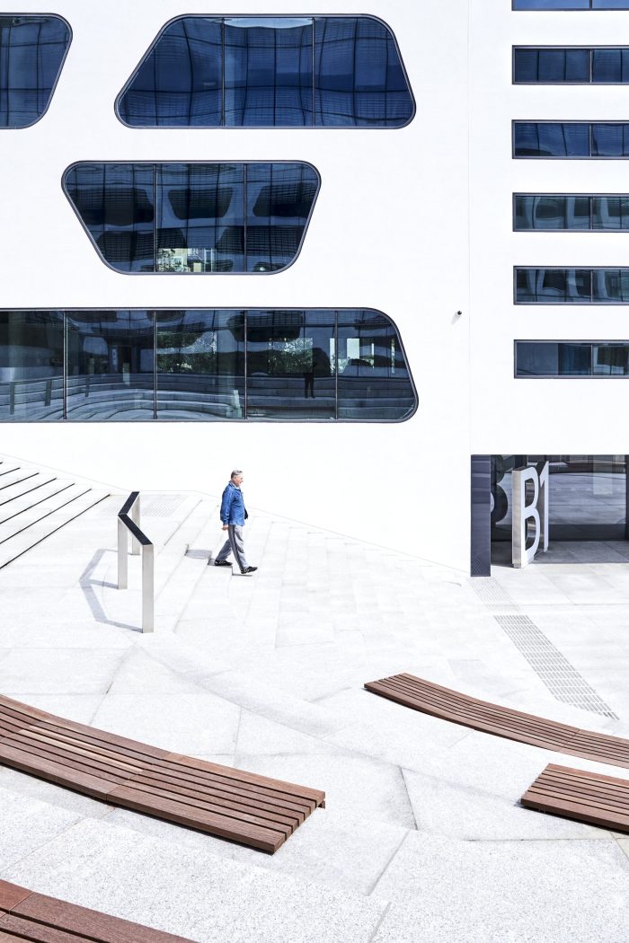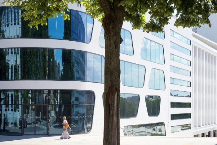 The extraordinary design sets off the extensive façades to bright and cheerful effect, creates modern workspaces, and uses organically shaped green spaces, curved pathways, seating levels, and the latest technology to transform the space into inspiring terrain with an urban ambiance.