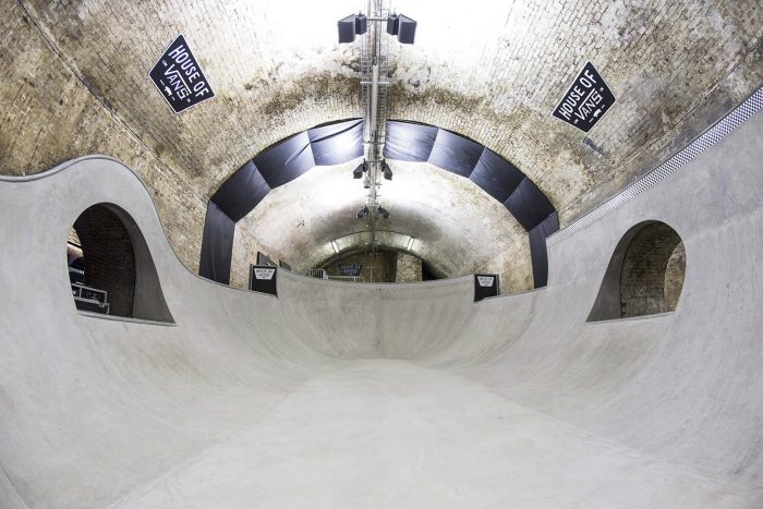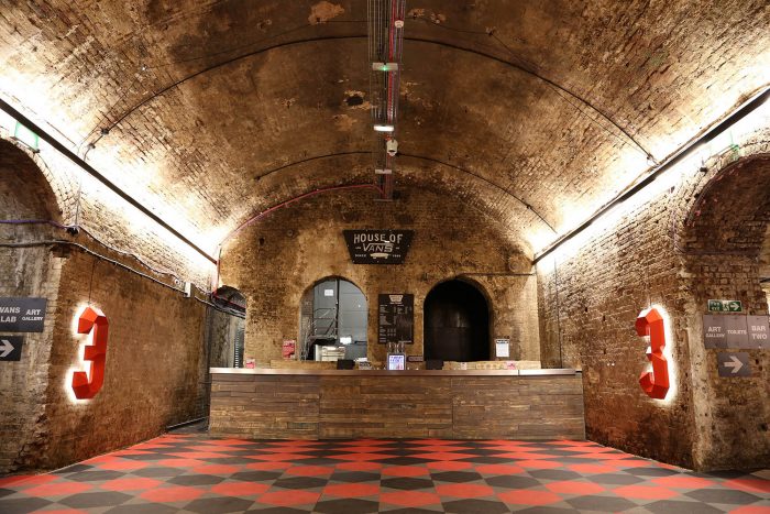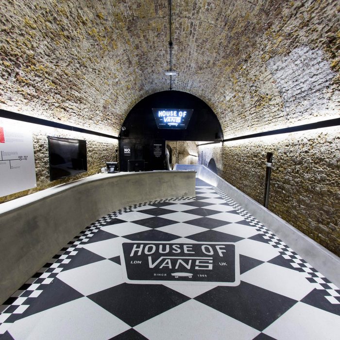 The House of Vans London is a new mixed use creative venue for Vans enthusiasts and those interested in skateboarding culture. It has been established as a place to participate in the cultural lineage of skateboarding that has defined the Vans brand since 1966, combining skateboarding, art, film and music. The new venue includes an art gallery, ‘Vans labs’ creative spaces, screening room, live music for 850 people, a premium café, numerous bars and a three tier indoor concrete skate park. It is the largest permanent venture by Vans globally and the first European edition of the House of Vans, following the first in Brooklyn NY back in 2010.