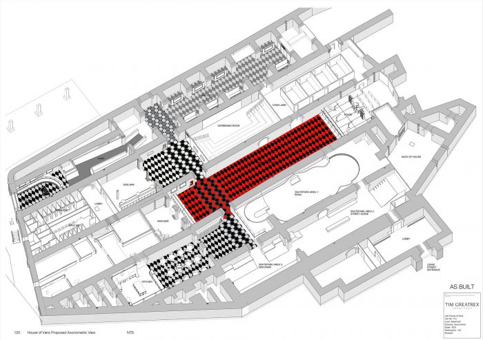 Rubber was the obvious choice of material for the floor as it is the material for the Vans shoe and the core material of the original Vans Doren Rubber Company. It was also chosen for its durability, natural resistance to water (appropriate for the site), it’s contrasting to the raw brickwork of the space, and recyclable at the end of the project. The choice of durable yet reusable/recyclable materials was very important to the designers and the client. The underlay for the rubber floor is made of modular plastic tiles which at the end of the project can be dismantled, packaged up, and then used on another project. The other benefits of recycled rubber are its resistance to slip in the damp environment; its ability to be (water jet) cut precisely to the intricate geometric shapes required and can also be provided in a range of colours for visual guidance through the space. The rubber floor provides a clean and comfortable surface but at the same time visually creates a strong contrast to the raw and textured brick walls and vaulted ceiling.