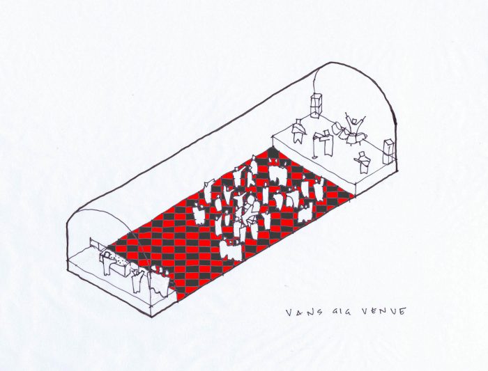 The plan for the skatepark was for it to accommodate three tunnel spaces to allow for varying layouts and abilities. The main space is the concrete ‘bowl’ predominantly for professional use, the second area is the ‘street scene’ for medium ability and the third is the ‘mini ramp’ skate park area for beginners or relaxed users. The five separate tunnels of the site are unified with the large and impressive rubber floor. The iconic sole of the Vans shoe inspired the layout of the hexagon and diamond pattern, with the strip of hexagons of the sole made to align with an enfilade of arches to delineate a main axis and corridor through the Venue.