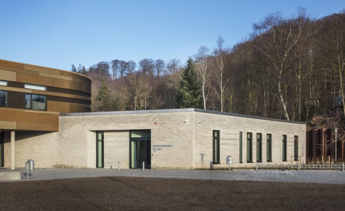 The hospital is gently placed at the bottom of a forest covered hillside. The plan layout is made up of smaller square masonry building units that twist from another, which makes room for prolonging the surrounding nature into the spaces between the buildings. The building breaks down the scale, merge with the landscape and thereby match the surroundings.