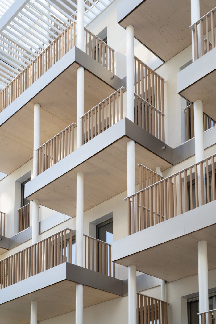 Innovations and technical specifications. Solar panels installed on the roof ensure a virtuous cycle of exploitation of natural resources. The floors of the balconies are made from the recovery of CLT window off-cuts. The facade coating was made with an ATEX (a French label for the creation of technical innovation) developed specifically for the project. The railings are made of Geolam composite wood resin, a durable and weather-resistant material.